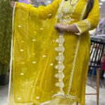 Attractive 3pc organza pakistani pant set with thread & laces work on all over the kurta & matching thread work on kurta borders & sleeves with matching plain pant with matching work on organza dupatta.