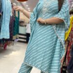 Attractive 2pc muslin kaaftan set with hand work on upper part & leheriya print on all over the shirt with matching printed pant & laces borders on kaaftan & pant.