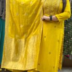 Attractive 3pc dola silk pant set with hand & thread work on all over the kurta with matching plain pant with matching benarasi dupatta.