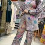Attractive 2pc muslin coord set with hand work on collars & upper part & print pattern on all over the top with matching printed pant.