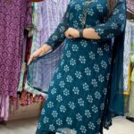 Attractive 3pc chinnon pant set with original mirror work on upper part & print all over the kurta with matching plain pant with matching shiffon dupatta & matching print on dupatta & pant borders.