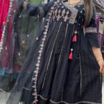 Attractive 3pc cotton angrakha style anarkali with thread & shifli work on upper part with matching thread work on pathani pant borders with matching thread work on organza dupatta borders.