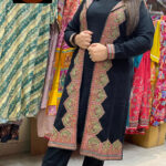 Attractive 3pc woollen shrug pant set with inner with thread work on shrug borders with matching thread work on pant borders.