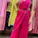 Attractive 2pc silk drape saree with heavy hand & sea shells work on all over the crop top with matching plain sharara with matching hand work also on belt & drape borders.