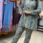 Attractive 2pc muslin coord set with hand & original mirror work on pocket & buttons & print pattern on all over the shirt with matching print pattern on all over the pant.