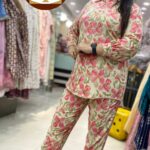 Out of StockAttractive 2pc muslin coord set with hand work on collar & print pattern on all over the shirt with matching print pattern on all over the pant with laces work on pant borders & balloon sleeves on top.