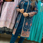 Attractive 3pc woollen shrug pant set with thread work on all over the shrug with matching plain woollen inner with matching plain woollen pant.