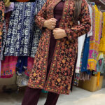 Attractive 3pc woollen shrug pant set with kashmiri kadhai on all over the shrug with matching plain woollen inner with matching plain woollen pant.