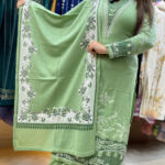 Attractive 3pc woollen pakistani pant set with hand work on upper part with matching work on borders of kurta & sleeves with matching work on pant borders with matching thread work on borders of the shawl.