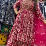Attractive 3pc rayon front slit cut peplum set with hand & original mirror work on upper part & belt also with matching printed sharara with printed dupatta & matching print borders on dupatta.