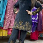 Out of StockAttractive 2pc velvet coord set with thread work on collar , sleeves & shirt borders with matching thread work on borders of pant.