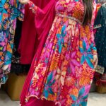Attractive 3pc chinnon lotus cut palazzo set with hand work on upper part & print pattern on all over the kurta with matching plain palazzo with matching print on designer dupatta borders & hand work also on waist.