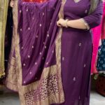 Attractive 3pc dola silk pant set with hand work on V-neck & all over the kurta & sleeves borders with matching plain silk pant with matching benarasi dupatta.