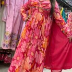 Attractive 3pc chinnon digital printed naira cut with original mirror work around the pads with digital print on all over the kurta with matching pants & dupatta.