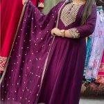 Out of StockAttractive 3pc silk Anarkali pant set with hand work on all over the kurta with matching pant & hand work on all over the dupatta..