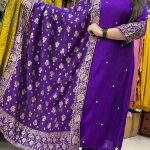 Out of StockAttractive 3pc dola silk pant set with work around neck with plain pants & banarasi work on all over the matching dupatta.