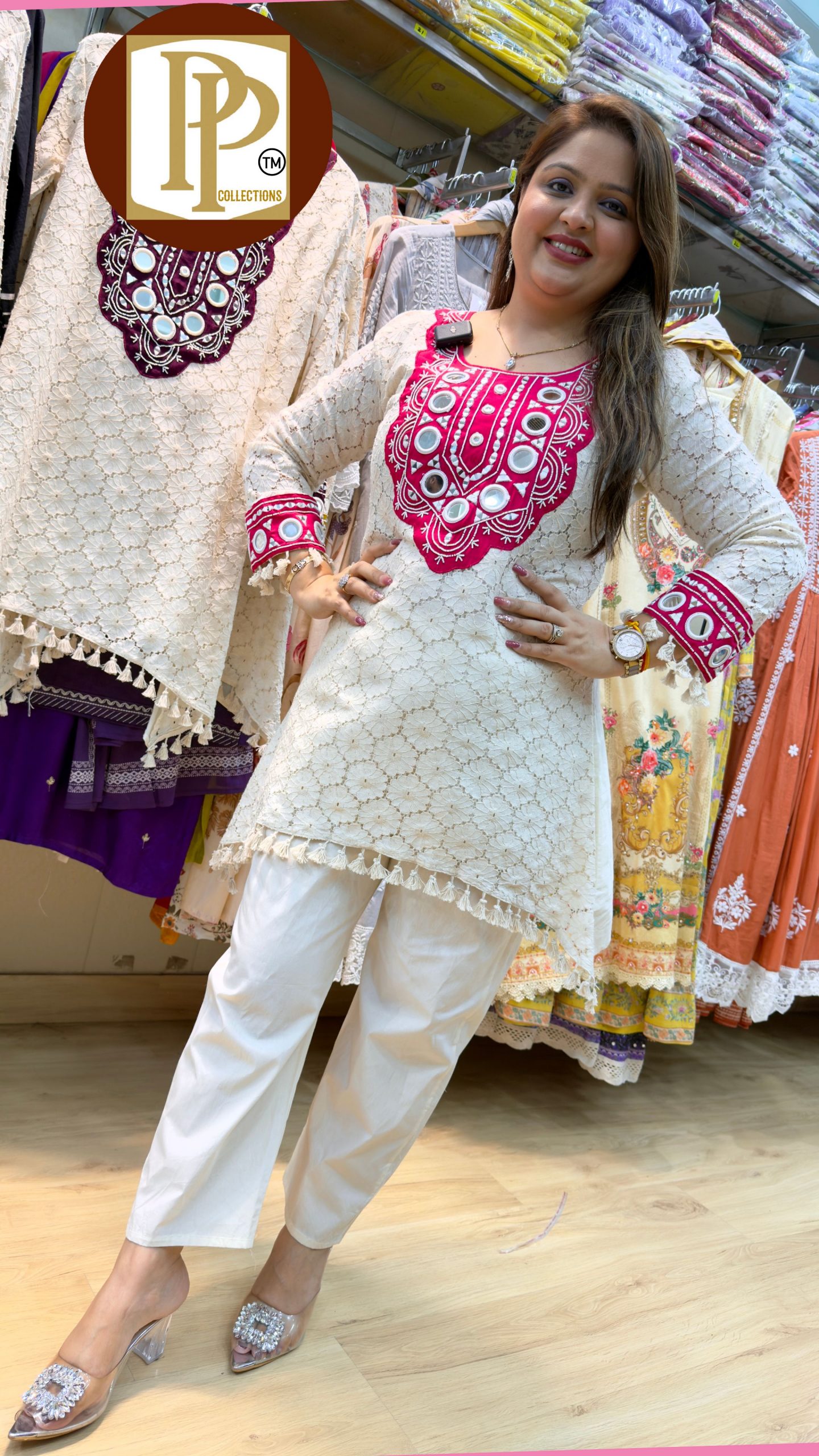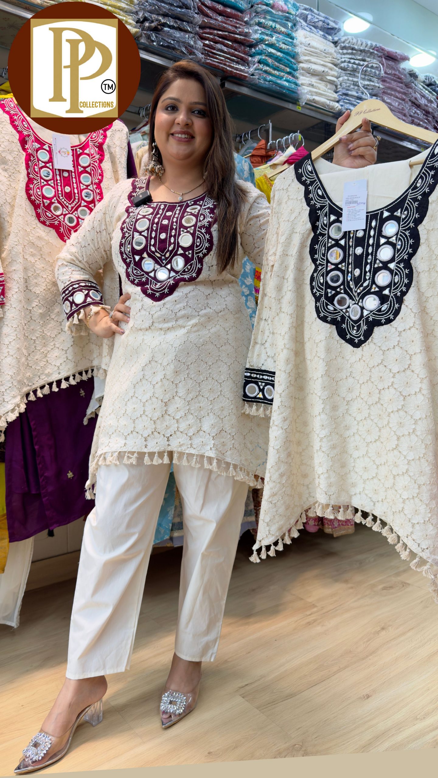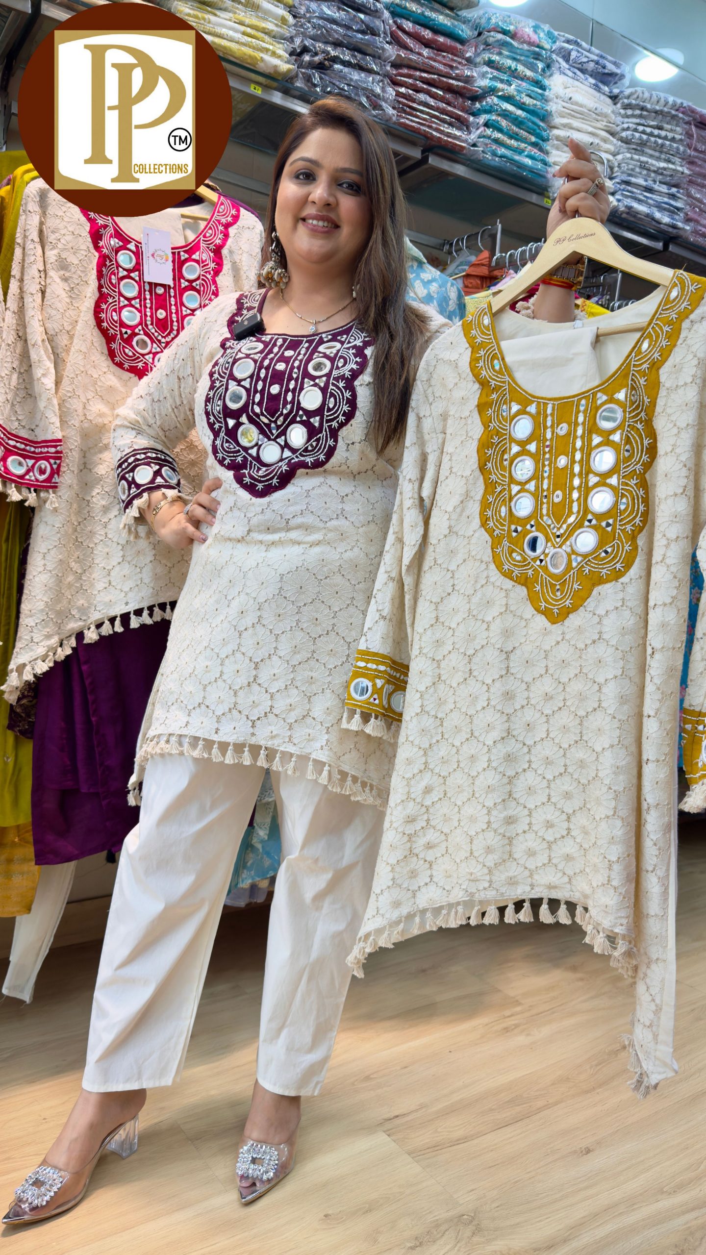 Description : 2piece Pant Set Fabric Type : Cotton Style : A-Line Co-ord Sets Work Type : Hakuba Chicken On Hand & Original Mirror Work.