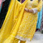 Attractive 3pc cotton pant set with laces work on upper part & sleeve borders with print pattern on all over the kurta with matching laces work & print on pant with matching cotton printed dupatta.