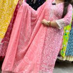 Attractive 3pc cotton pant set with laces work on upper part & sleeves with block print pattern on all over the kurta with matching laces work also on pant borders with matching print cotton dupatta.