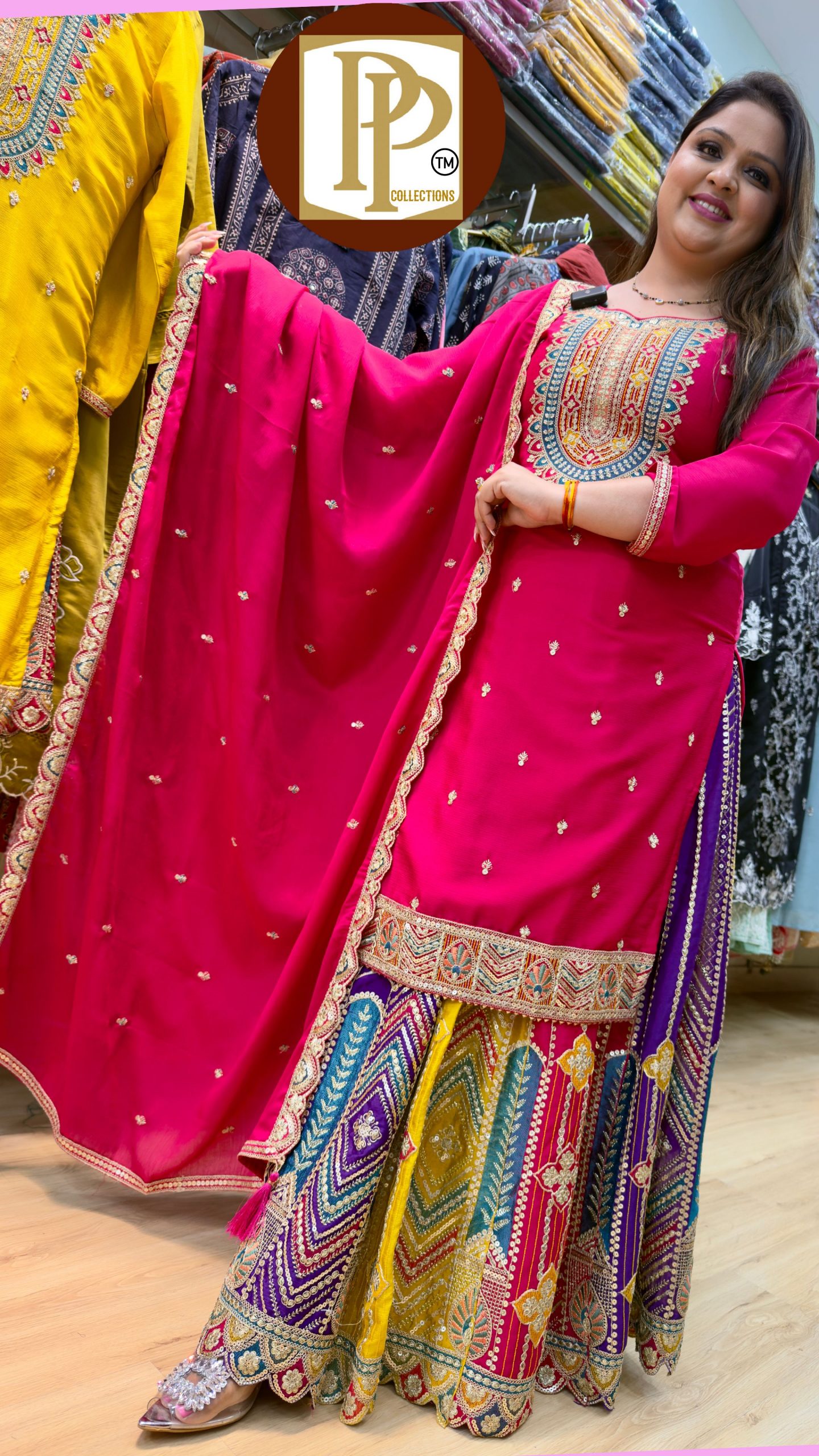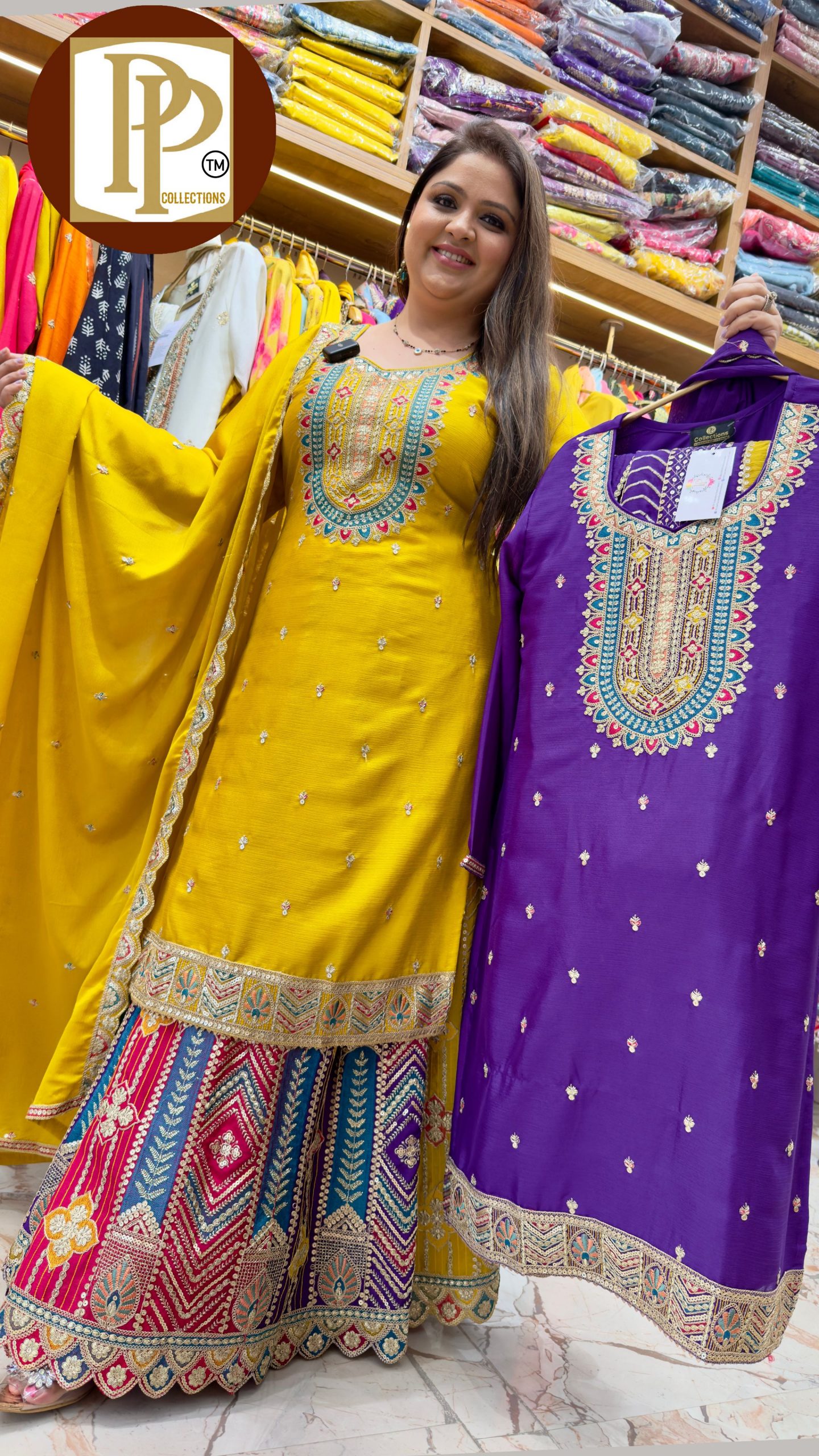Description : 3piece Skirt Set Fabric Type : Chinnon Silk Style : Short Kurta & Skirt Work Type : Printed On Zari & Sippy Work With Matching Dupatta.