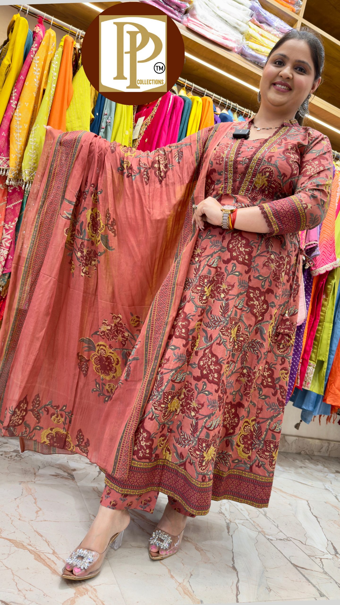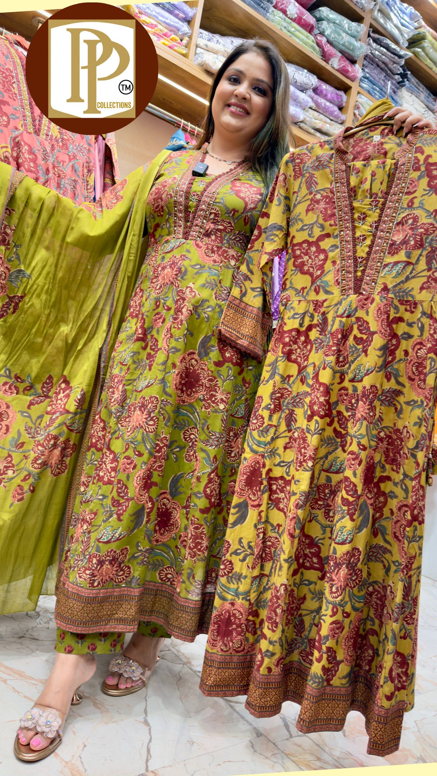 Description : 3piece Pant Set Fabric Type : Cotton Style : Anarkali Set Work Type : Printed On Hand Work With Matching Dupatta.