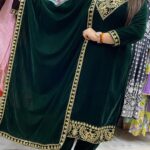 Attractive 3pc velvet pant set with thread & sippy work upper part & borders of kurta & sleeves with matching thread & sippy work on borders of pant with matching thread & sippy work on all over the shawl.