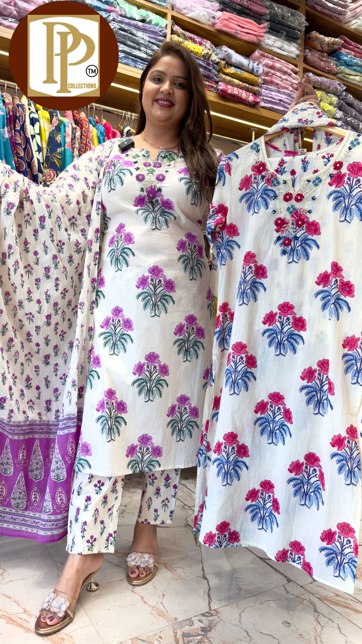 Description : 3piece Pant Set Fabric Type : Cotton Style : Straight Set Work Type : All Over Printed On Thread & Hand Work With Matching Dupatta.