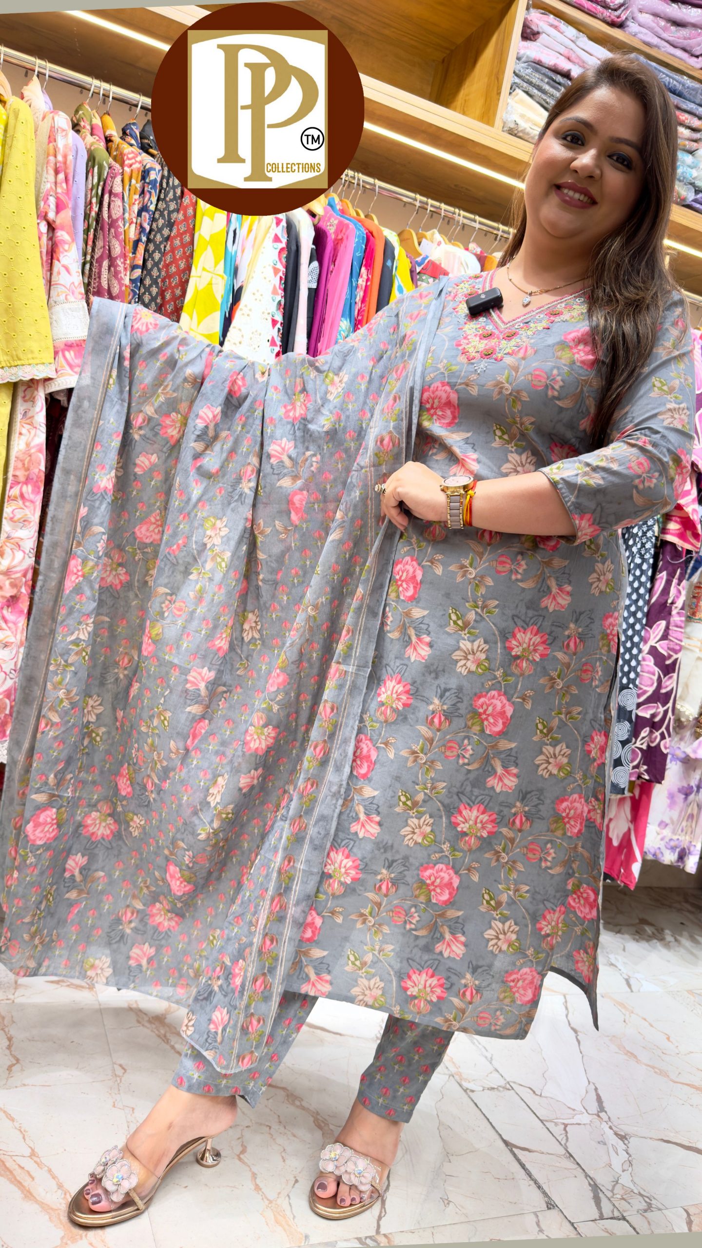Description : 3piece Pant Set Fabric Type : Cotton Style : Straight Set Work Type : All Over Flower Print On Hand & Thread Work With Matching Dupatta.