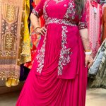 Work Type : heavy Threadwork in gown and attached jacket with drape style with matching belt .