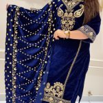 Description : 3pcs velvet suit Fabric Type : velvet Style : shirt with divider Work Type : heavy Jari work in neck and matching heavy Jari work in shawl .