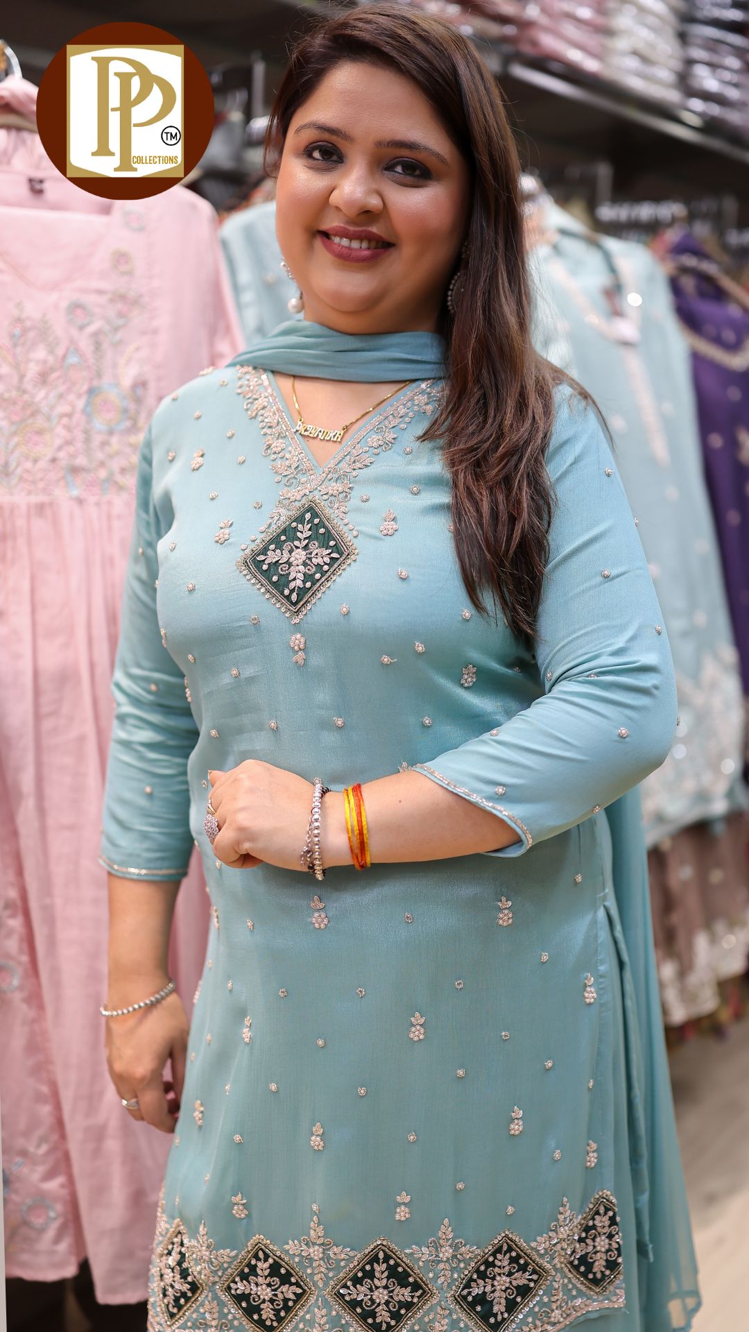 Work Type : full heavy handwork stone work in kurta with matching divider & dupatta .