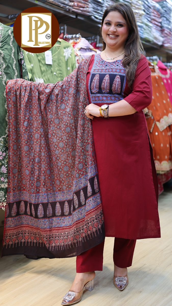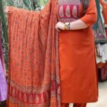 Work Type : full heavy azrak printed work in kurta with matching pants & dupatta.
