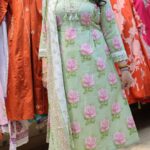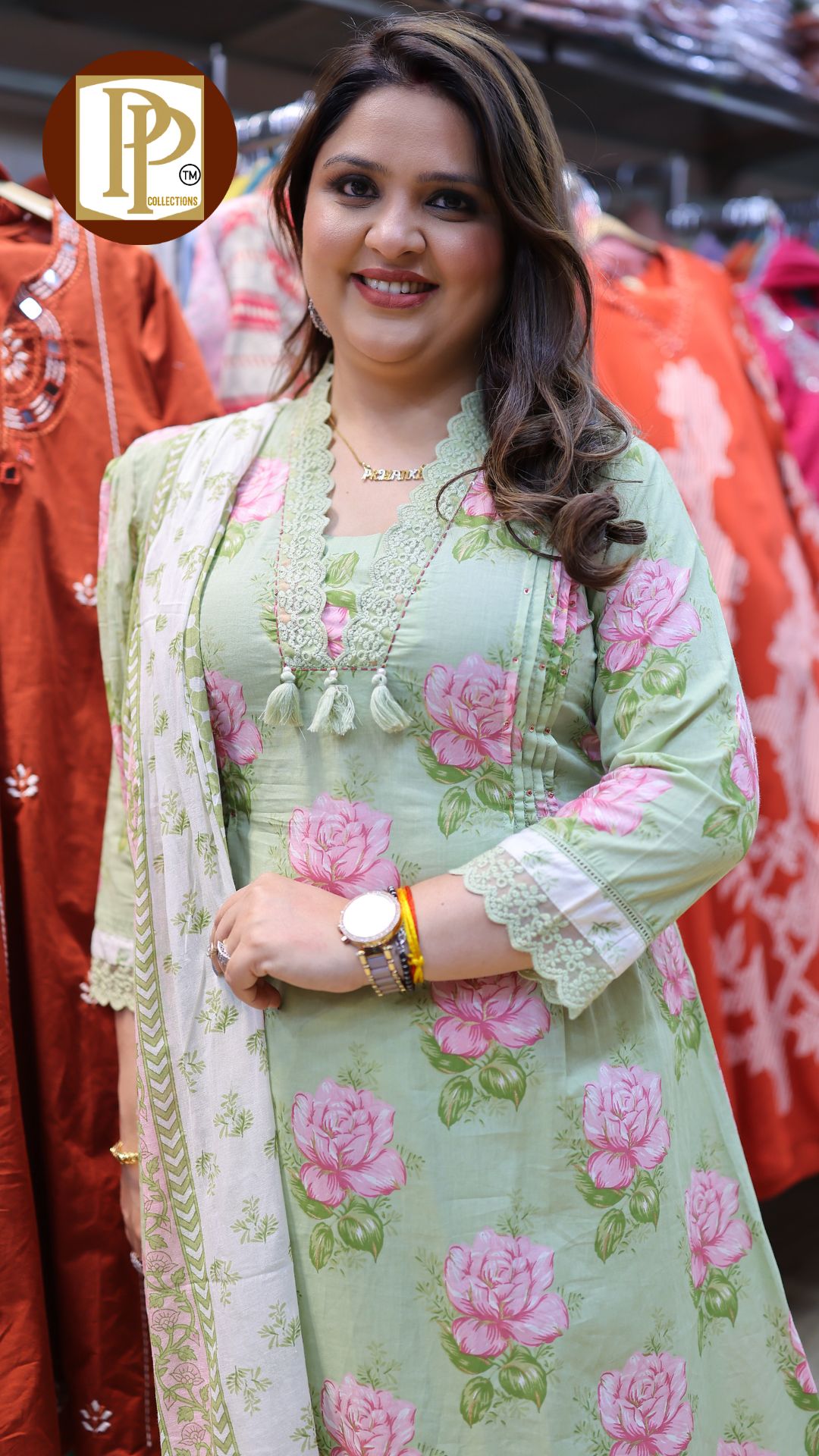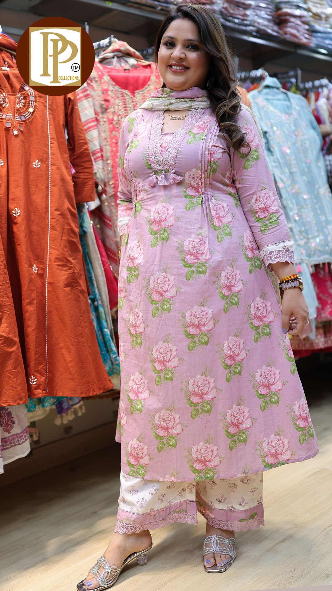 Work Type : full threadwork laces work all over printed aline kurta with matching printed dupatta & pants .