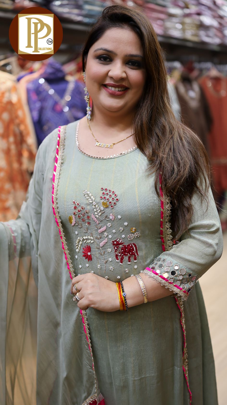 Work Type : full heavy handwork original mirror work in kurti & sleeves with matching palazzo & dupatta .