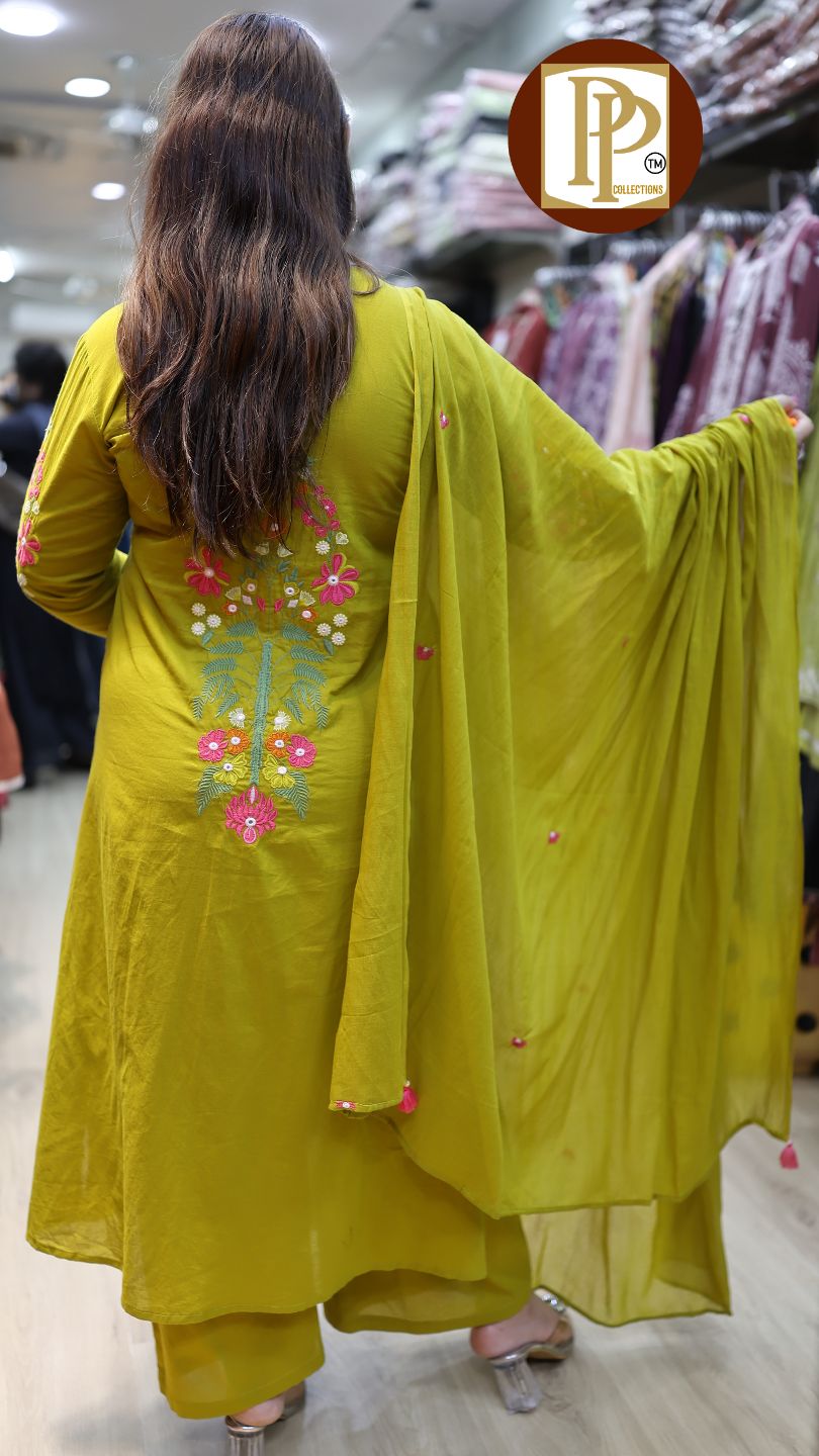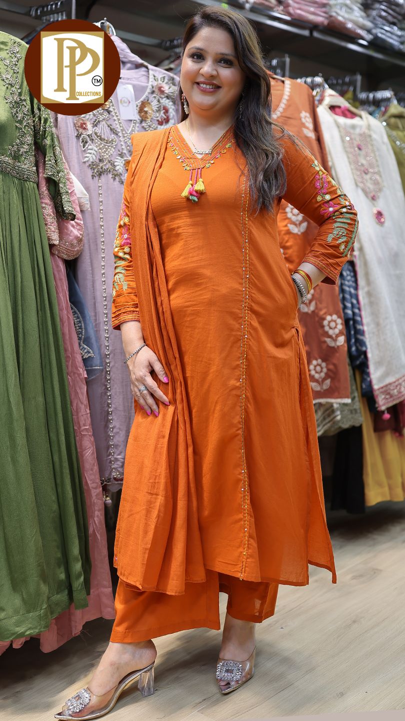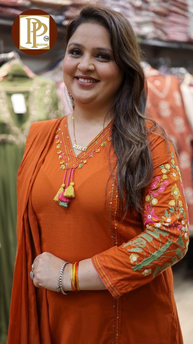 Work Type : full heavy threadwork handwork in kurta & attached pocket with matching pants & dupatta.