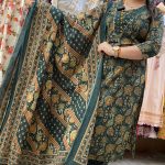 Attractive 3pc cotton pant set with hand work on upper part with block print pattern on all over the kurta with matching printed pants with matching printed cotton dupatta.