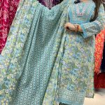 Attractive 3pc cotton straight suit with laces work on upper part with block print pattern on all over the kurta with matching print pattern on pants & printed matching dupatta.