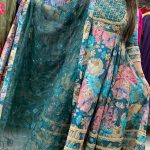 Attractive 3pc cotton muslin anarkali pant set with hand work on upper part with floral printed pattern on all over the kurta with matching pants & dupatta with cotton inner lining on kurta.