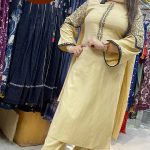 Attractive 3pc rayon pant set with black thread work on sleeves & upper part with plain matching pants & plain shiffon dupatta.