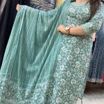 Attractive 3pc cotton pant set with thread & foil mirror work on upper part with print pattern on all over the kurta with matching plain pants & matching printed pattern on all over the cotton dupatta.
