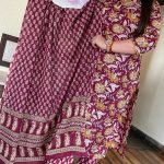 Attractive 3pc cotton pant set with block print pattern on all over the kurta with matching print pattern on pant with matching printed dupatta & thread work on V-neck.