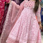 Attractive 3pc cotton anarkali pant set with hand work on upper part with printed pattern on all over the kurta with laces borders on kurta with matching laces work on palazzo with matching work also on dupatta.