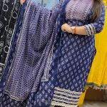 Attractive 3pc cotton lurex pant set with hand & print pattern on all over the kurta with matching gota & laces work on sleeves & kurta borders with matching work on pant borders & dupatta.