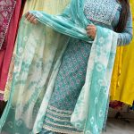 Out of StockAttractive cotton 3pc pant set with thread & laces work on upper part with block print pattern on all over the kurta with laces work on borders with matching laces work also on matching pant borders with tie & dye print cotton dupatta.