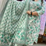 Attractive 3pc cotton pant set with hand work on upper part with block print pattern on all over the kurta with matching print pattern on pants with matching cotton dupatta.