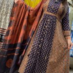 Attractive cotton 3pc anarkali pant set with thread work on upper part with print pattern on all over the kurta with matching print pattern on pants with matching print cotton dupatta.