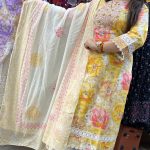Out of StockAttractive 3pc cotton pant set with thread & hand work on upper part with block print pattern on all over the kurta with matching pants & printed cotton dupatta.