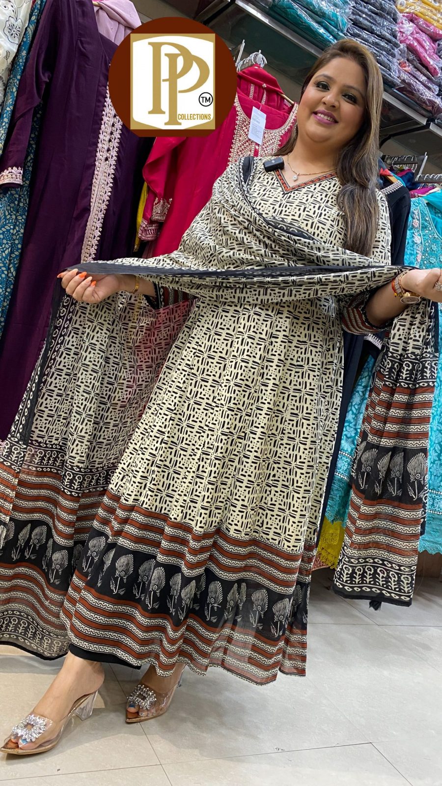 Attractive 3pc cotton anarkali pant set with thread work on V-neck with print pattern on all over the kurta with matching pants & printed pattern on all over the cotton dupatta.