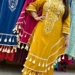 Attractive 2pc cotton hand work coordset with thread & foil mirror work on all over the top with A-Line style & matching palazzo.