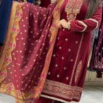 Description : 3piece Plazzo Set Fabric Type : Velvet Style : Pakistani Stright Set Work Type : Thread & Laces Work With Matching Banarasi Dupatta.